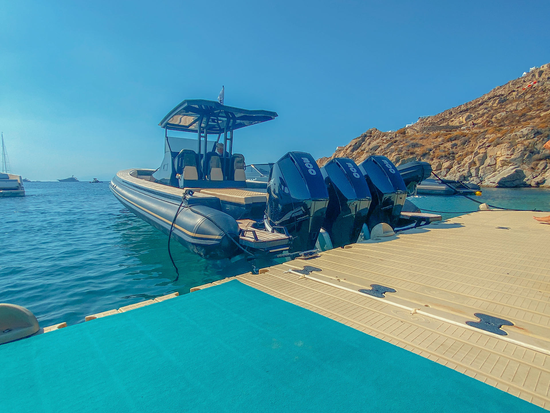 We also take pride in operating the largest privately owned fleet of high-end RIB boats in Mykonos. This capacity allows us to provide reliable and consistent service to all our guests. Booking a boat transfer in Mykonos with Don Blue Yachting means having full support for your transportation needs. We can easily manage multiple groups and last-minute requests while maintaining the highest standards of safety and professionalism. Our mission is to deliver an experience that reflects the luxury lifestyle of the Cyclades.